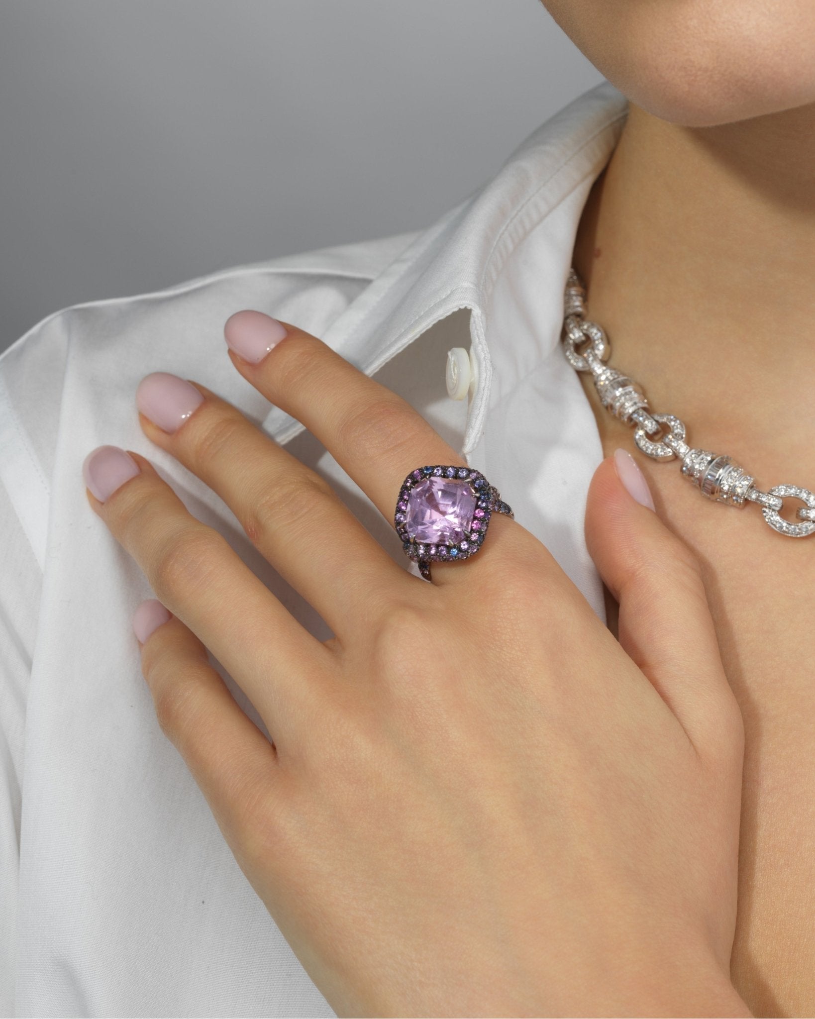 At the core of the Knockout Ring is a breathtaking Faceted Emerald Cut Square Kunzite, weighing 10.95 carats. Complementing this centerpiece are Round-shaped Tie-Dye Sapphires, showcasing a captivating blend of colors, totaling 2.84 carats. Crafted with precision, all set in Platinum.