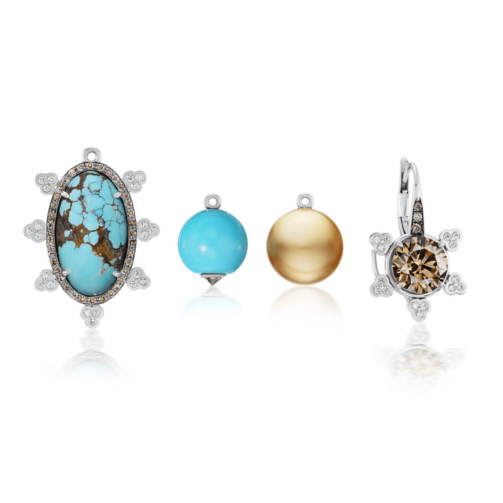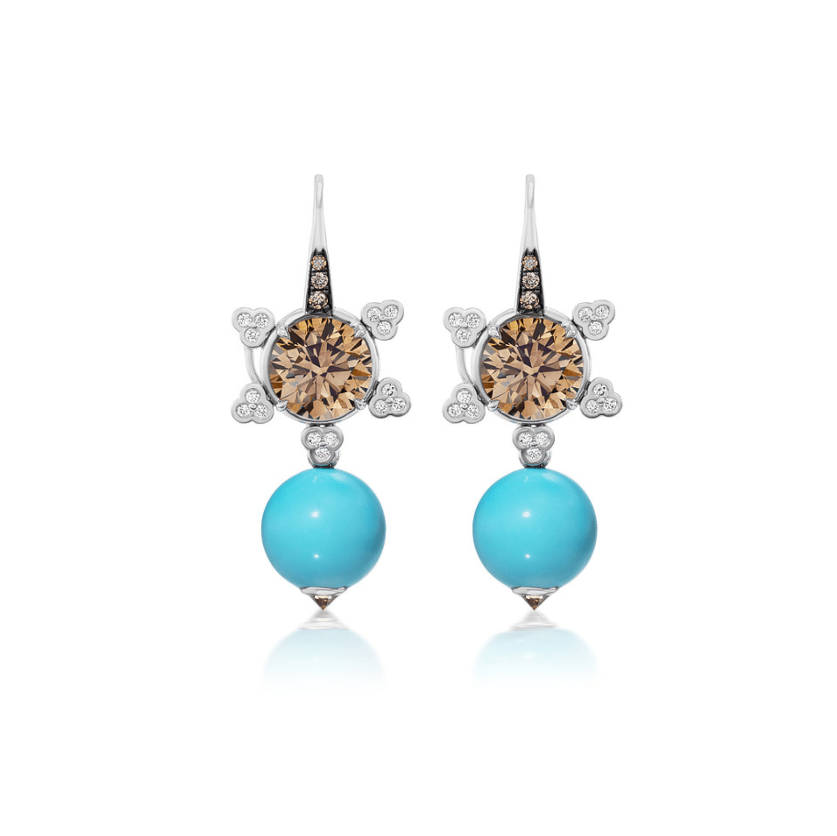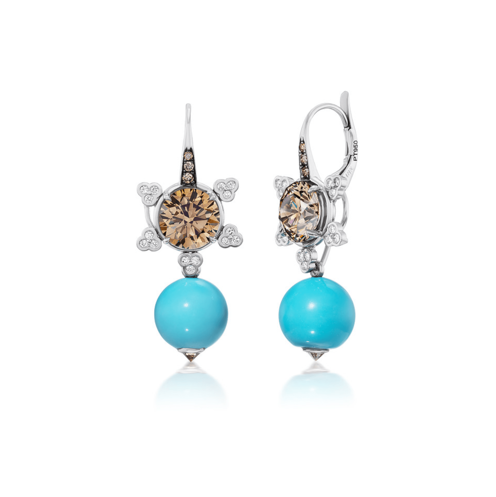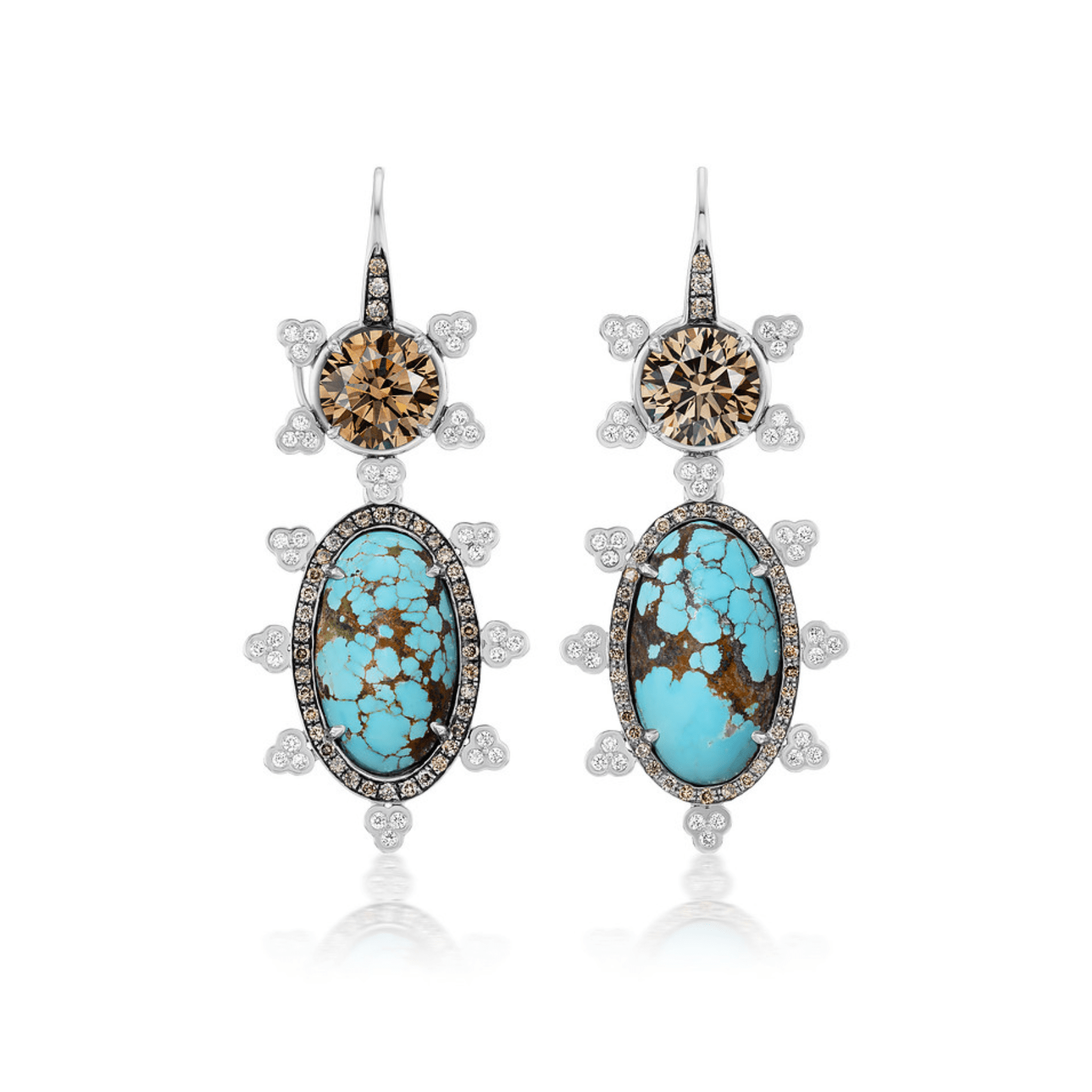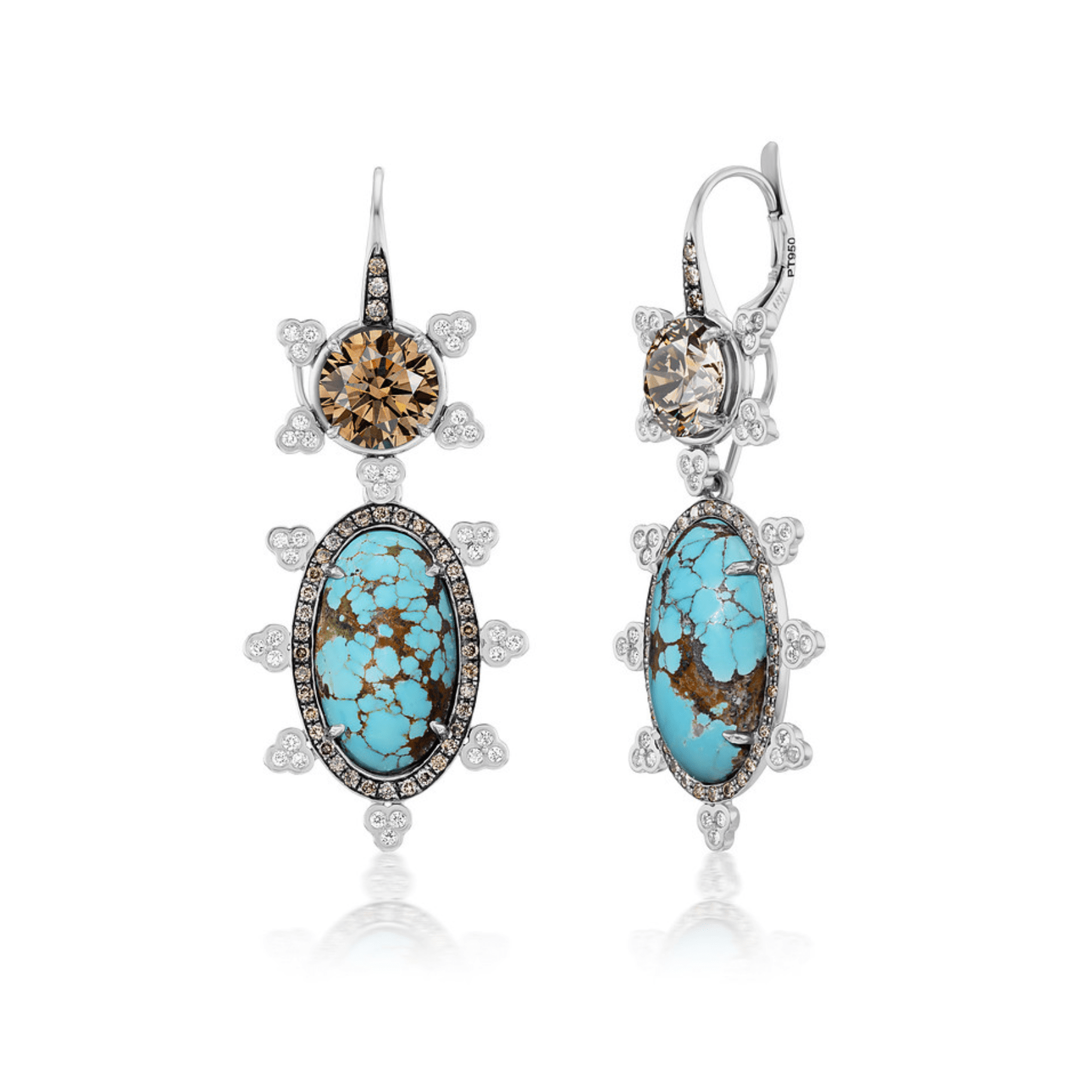 9.7 MM Turquoise Drops with Reverse Set Cognac Diamonds Set in Platinum